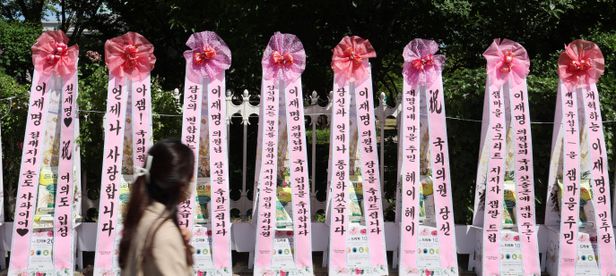 경력직 신입 의원 이재명 축하 국회 정문 늘어선 개딸들 화환