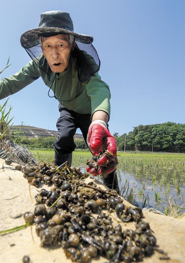 남미산 우렁이의 배신 우렁각시인줄 알았는디, 벼농사 베려부렀네 친환경농사 ‘효자’ 였지만 온난화로 덩치 커지고 번식 폭발 이젠 어린 모 갉아먹는 골칫덩이