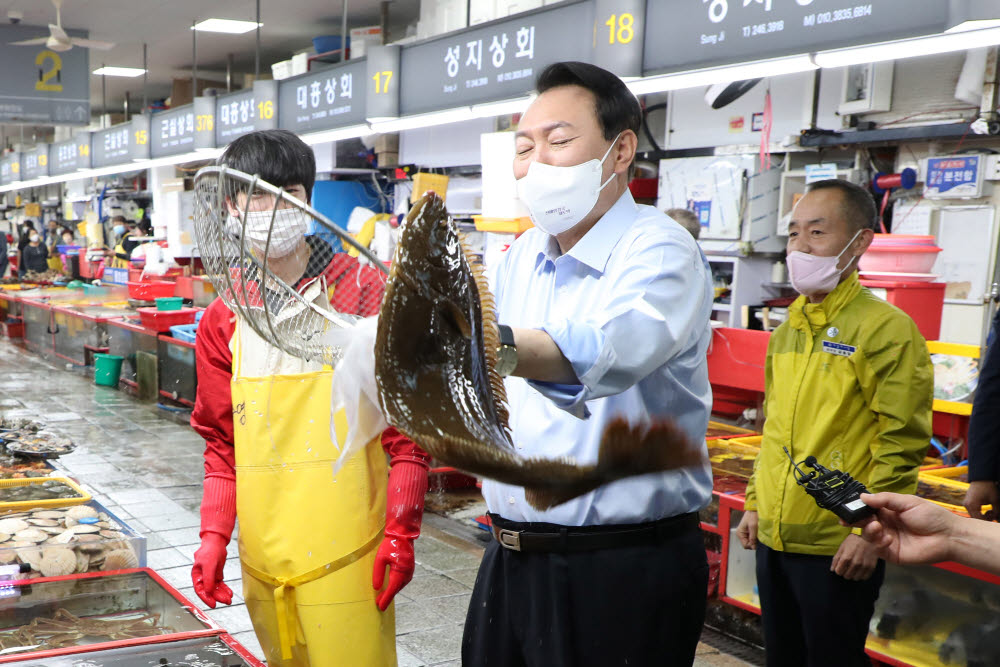 <윤석열 대통령이 31일 부산 중구 자갈치 시장을 방문, 활어를 뜰채로 건져 올리고 있다. 연합뉴스>