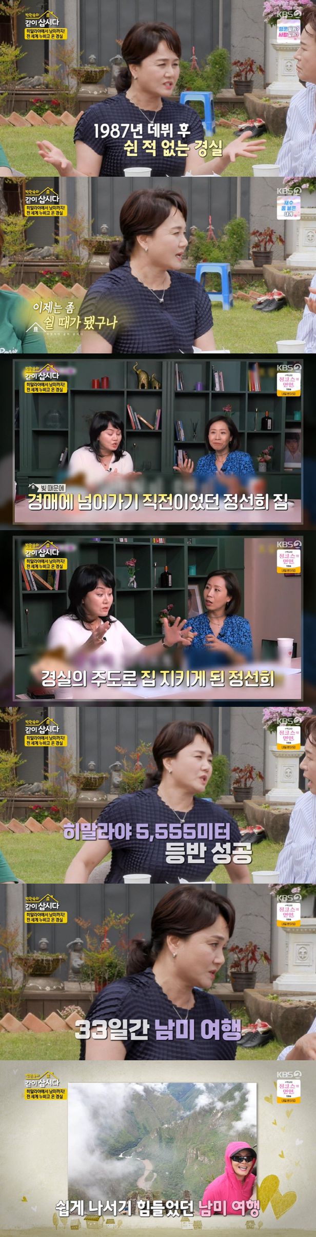 이경실은 "성격이 끙끙 앓는 스타일은 아니다. 금방 털어내는 스타일"이라면서 "어려움을 겪다 보니까 노하우가 생기더라"고 밝혔다. 이어 "산악회 친구들과 여행을 다녔다. 히말라야 등반에 성공했다. 눈물 콧물 흘리면서 올라갔다"면서 "코로나19 전 해에는 6개월 동안 계획을 세워서 남미로 33일을 다녀왔다"고 쉬면서 마음껏 즐긴 등산과 여행을 떠올렸다.