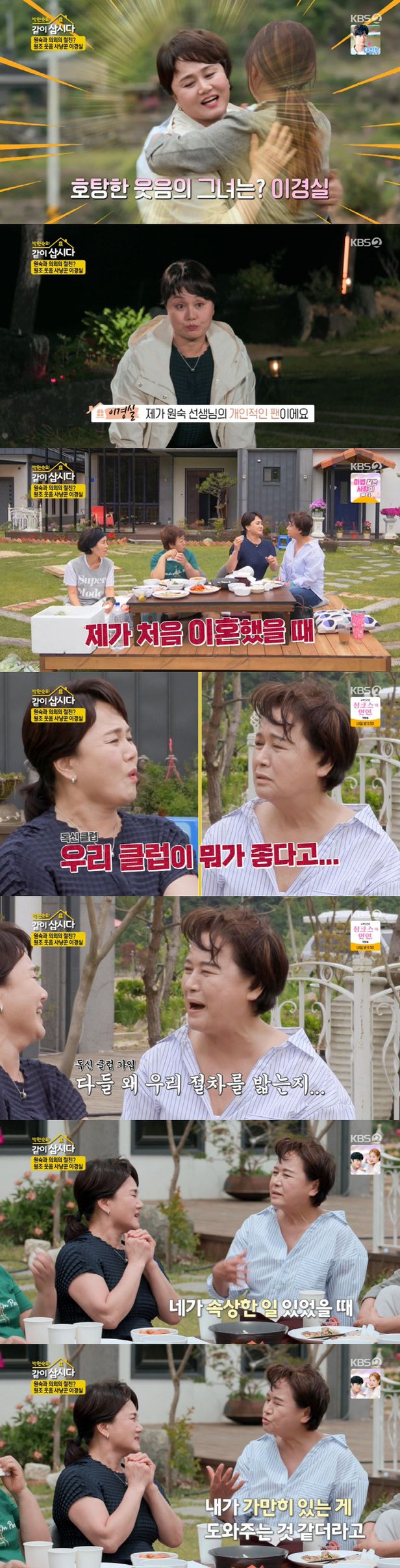 이경실은 "원숙 선생님의 개인적인 팬이다"면서 "1987년 방송 시작 때부터 인연이 시작됐다. 분장실에서 만나면 항상 좋은 말을 많이 해주셨다"고 떠올렸다. 그는 "처음 이혼 했을 때 전화가 와서 '우리 클럽이 뭐가 좋다고 가입을 하니'라고 하셨다"며 "기분이 안 좋을 때인데 선생님으로 인해서 크게 웃었다"며 힘든 시기 위로해줬던 박원숙에게 고마운 마음을 전했다.