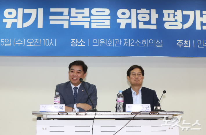 김병욱 더불어민주당 의원이 15일 오전 서울 여의도 국회 의원회관에서 열린 민주당 위기 극복을 위한 평가토론회에서 발제를 하고 있다. 오른쪽은 신동근 의원. 윤창원 기자