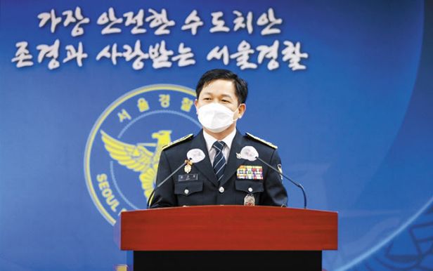지난해 7월 9일 열린 최관호 당시 신임 서울경찰청장 취임식 장면. 최 전 청장 배경에 쓰인 표어는 과거 통일혁명당 사건에 연루됐던 고(故) 신영복 전 성공회대 교수의 서체(어깨동무체)로 제작됐다. /서울경찰청