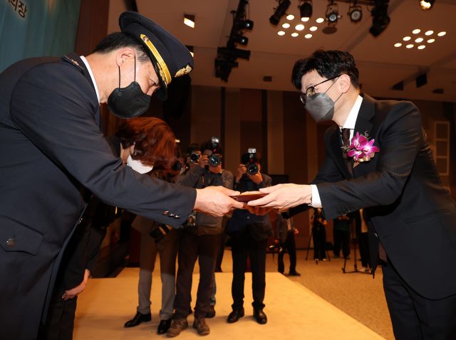 한동훈 법무부 장관이 16일 오전 서울 중구 프레스센터에서 열린 제40회 교정대상 시상식에서 대상 수상자로 선정된 서선교 대전교도소 보안과 교감에게 시상하고 있다. 연합뉴스