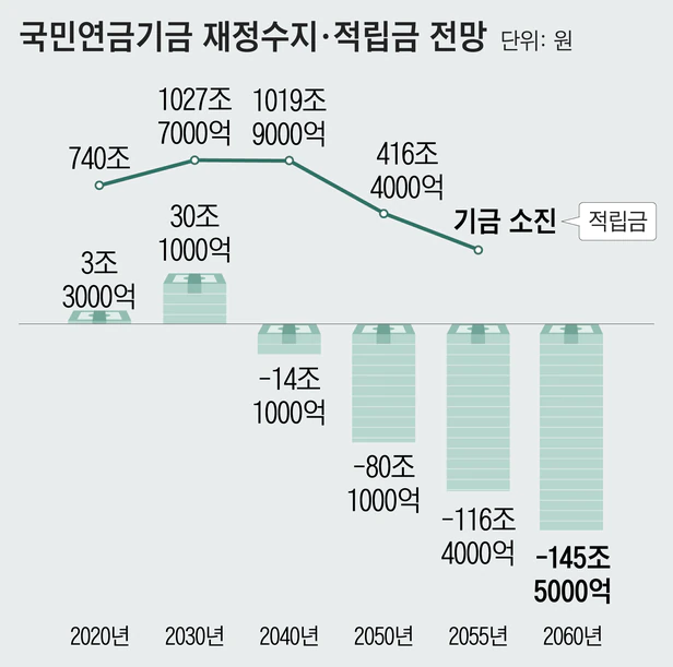 국민연금 재정수지는 2039년에 적자 전환하고, 2055년에 소진될 전망이다./자료=국회예산정책처