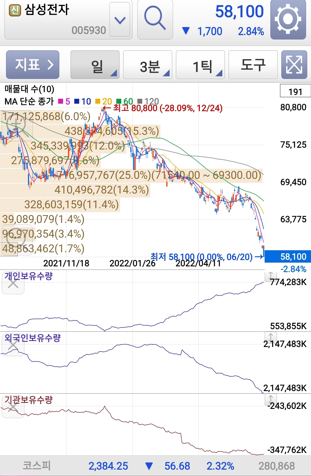 삼성전자가 무지하게 떨어지고 있어서 놀라울 따름이다. 이러다가 너무 지하로 내려가는 것은 아닌지 궁금할 따름이다.