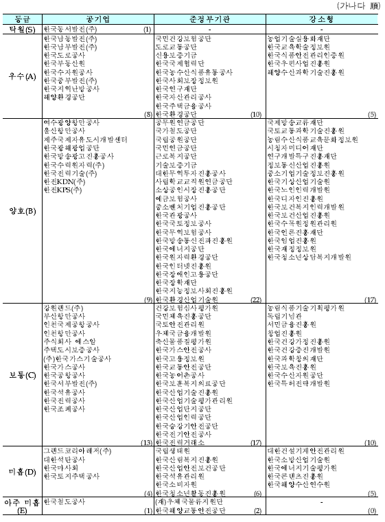 공공기관 경영 평가 등급은 S(탁월)·A(우수)·B(양호)·C(보통)·D(미흡)·E(아주 미흡) 등 6단계의 등급으로 나뉜다. 이날 130개 공개된 공기업·준정분기관에 대한 평가 결과, 종합등급 S는 1개(0.8%), A는 23개(17.7%), B는 48개(36.9%), C는 40개(30.8%), D는 15개(11.5%), E는 3개(2.3%)로 나타났다. 낙제점 이하 수준인 D와 E등급을 받은 공기업·준정부기관은 18개로 2020년 평가(19개) 대비 1개 줄었다. 전년도엔 전무했던 ‘S(탁월)’ 등급은 이번 평가에서 한국동서발전이 받았다.