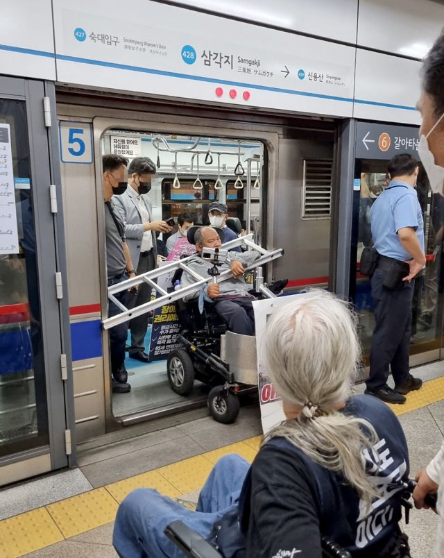 사다리 목에 걸고 지하철 출입문 막아선 전장연[청계천 옆 사진관]