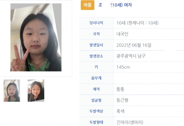 경찰청 실종자찾기센터(안전드림) 사이트에 올라온 실종된 조모양 사진과 정보. 안전드림사이트 캡쳐.