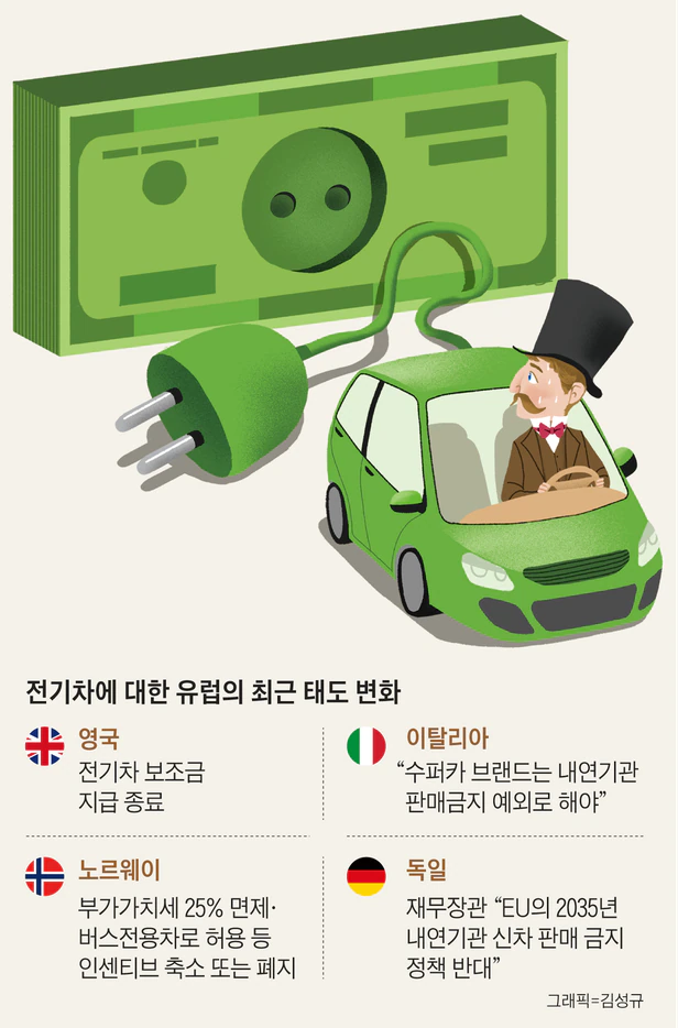 영국 전기차 보조금 폐지 독일 내연기관차 퇴출 반대 전기차 전환 선봉 유럽 급브레이크 비상 걸린 경제 안보 공급망 붕괴 부품·소재값 급등 전기차 제조비용 회의론 한·중·일에 배터리 의..