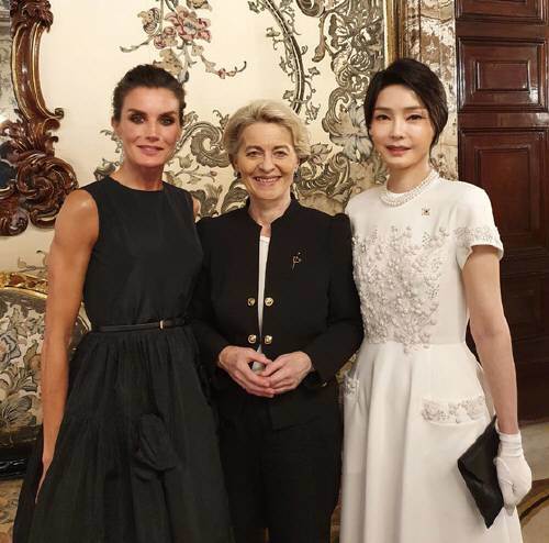 김건희 여사가 28일 오후(현지시간) 스페인 마드리드 왕궁에서 열린 펠리페 6세 국왕 부부 주최 만찬에 참석해 레티시아 스페인 왕비(왼쪽), 라이엔 EU 집행위원장(가운데)과 기념촬영하고 있다. (대통령실 제공)