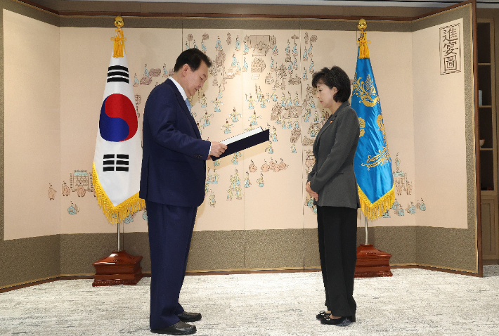 윤석열 대통령은 5일 박순애 사회부총리 겸 교육부 장관에 임명장을 수여했다. 윤 대통령은 이날 오전 용산 대통령실에서 박 장관에게 임명장을 수여하면서 "언론 또 야당에 공격을 받느라 고생