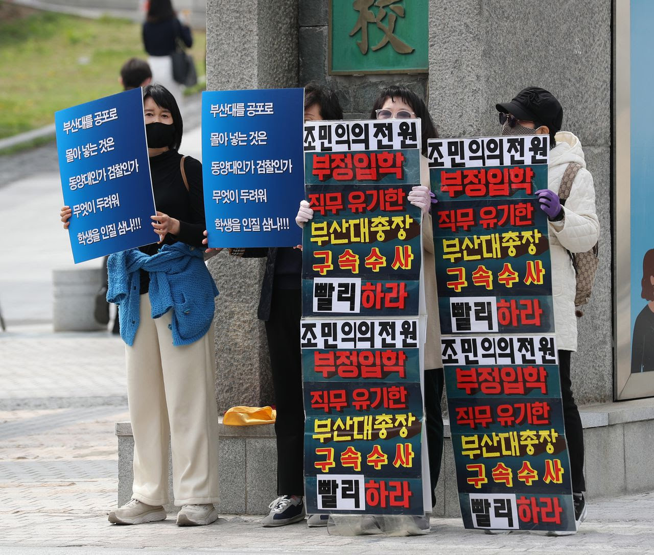 지난 4월 5일 오후 부산 금정구 부산대학교 정문 앞에서 조국 전 장관의 딸 조민씨 부산대학교 의학전문대학원 입학 취소 찬반 집회가 동시에 열리고 있다. 왼쪽은 조민씨 입학 취소 반대를 주장하는 '부산당당', 오른쪽은 조민씨 입학 취소를 촉구하는 '정의로운 사람들'. /뉴스1