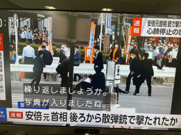 NHK는 8일 주변 목격자에서 받은 영상을 속보에서 보도했다. 사진에는 아베 전 총리가 쓰러진 주변을 검은 양복의 경호원들이 둘러싸고 있다. 경찰은 총격 직후에 40대 남성 용의자를 체포했다. 주변 목격자는 NHK에 “2번째 총성에 아베 전 총리가 쓰러졌다”고 말했다. 또 다른 목격자는 “총을 쏜 용의자는 쏜 다음에 도망가지 않고 그 자리에 있었다”고도 했다.