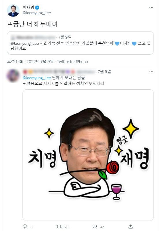 이 의원은 이날 이른바 ‘트위터 마실’을 했다. 새벽 0시 58분부터 2시 45분까지 18개의 답글과 글을 남겼고, 여러 지지자의 글을 리트윗했다. 한 지지자가 ‘저희 가족 전부 민주당원 가입할 때 추천인에 이재명 쓰고 입당했다’는 글을 남기자, 이 의원은 “또금만 더 해두때여”라는 답글을 남겼다.