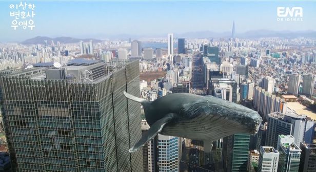 극 중 우영우가 가장 좋아하는 고래는 우영우가 남다른 생각으로 사건을 해결할 때 마다 등장해 세상을 헤엄친다. 고래는 자폐 스펙트럼을 가진 우영우가 스스로를 유폐한 것이 아닌, 우영우가 만들어가는 더 넓은 세상이 존재한다고 말해준다. /에이스토리·KT스튜디오지니·낭만크루