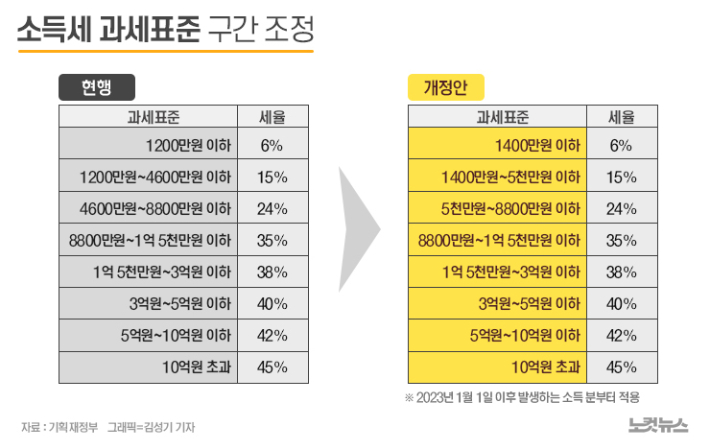 15% 세율 적용 구간도 '1400만 원 초과 5천만 원 이하'로 상향된다.