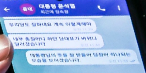 권 원내대표의 휴대전화에는 보낸 이가 ‘대통령 윤석열’로 표기돼 있으며, 이 발신자는 “우리 당도 잘하네요, 계속 이렇게 해야”라며 “내부 총질이나 하던 당대표가 바뀌니 달라졌습니다”라고 권 원내대표에게 메시지를 보냈다.