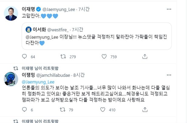 이 의원은 이날 새벽 1시쯤부터 이른바 ‘개딸(개혁의딸)’이라 불리는 지지자들과 트위터에서 대화를 이어갔다. 네티즌들은 “이 힘든 걸 성남시장 시절부터 겪은 이 의원님, 너무 죄송하다. 언론의 주목을 받게 될 걸 알면서도 강한 민주당을 위해 당 대표에 출마해주셔서 감사하다” “앞으로도 댓글 정화하면서 끝까지 지키겠다” “날조 기사들 너무 많이 나와서 화나는데 다들 열심히 (댓글) 정화하고 있어요” “뉴스 댓글 걱정하지 말라잔아(잖아) 가좍(팬)들이 책임 진다잔아(잖아)” 등의 글을 남겼다.
