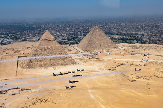 공군 특수비행팀 블랙이글스가 3일(현지 시각) 이집트 카이로 인근 기지 피라미드 일대에서 진행된 피라미드 에어쇼 2022에서 비행하고 있다.