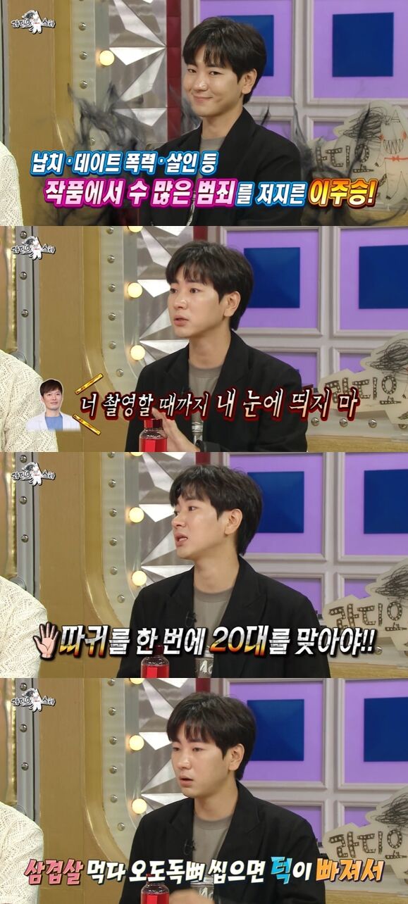 따귀 100대 맞고 턱 빠져 이주승 악역하기 힘드네 배우 생활 15년 중 9할을 악역만 소화 스태프들도 혐오스럽게 쳐다봐 왁스 칠 화상 입고 죽은 상태 분장 삼겹살 오돌뼈 씹다가