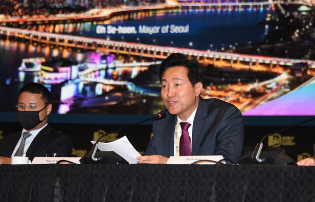 오세훈 서울시장이 지난달 31일 오후(현지시간) 마리나베이샌즈 컨벤션홀에서 열린 '2022 세계도시정상회의 시장포럼'에서 특별 연설을 하고 있다. (서울시 제공) /뉴스1