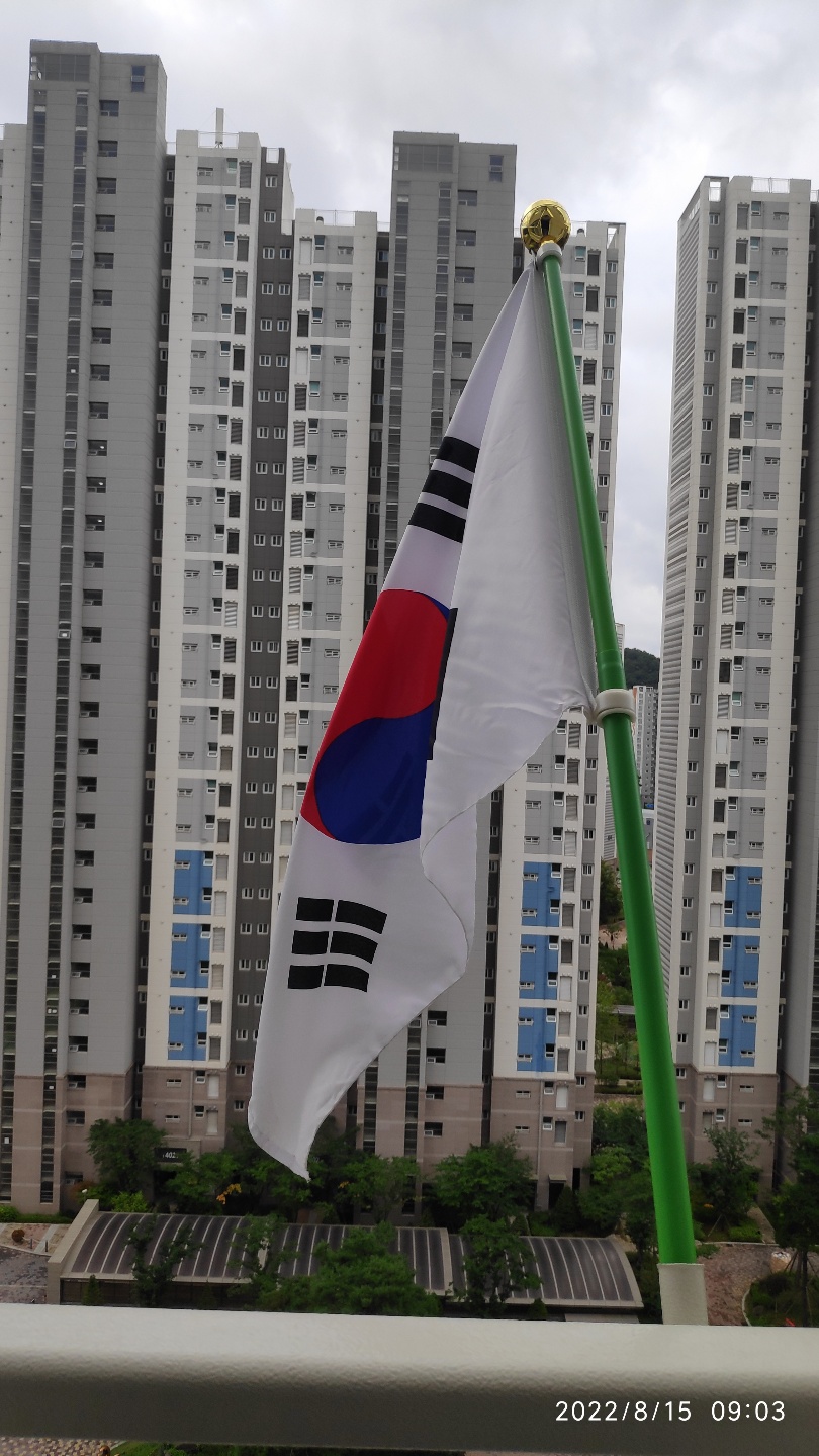 국기 게양완료 모습이다. 마침 바람이 아래로 불길래 손으로 살짝 잡아서 촬영을 해봤고, 마침 반대로 잡았길래 좌우를 뒤집어보았다.