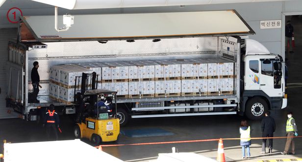 고범준 기자 = 정부가 미국 제약사 화이자에서 구매한 코로나19 백신 150만6천회분이 도착한 2021년 11월 10일 오후 인천국제공항 화물터미널에서 관계자들이 백신을 수송차량으로 옮기고 있다. 2021.11.10./ 뉴시스