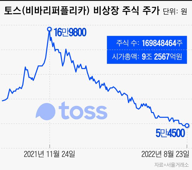 비상장 주식의 주가 하락과 관련, 토스 관계자는 “최근 세계적인 투자 심리 위축속에서도 지난달 3000억원의 신규 투자를 유치한 시리즈G에서는 8조5000억원의 기업가치를 평가받았다”라며 “토스의 성장에 대한 기관투자자들의 시선은 우호적인 상태”라고 말했다.