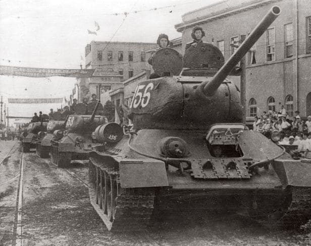 1950년 7월 대전 시가에 진입한 북한 인민군 탱크부대. 남침 3일 만에 서울을 점령한 북한군은 7월 20일 대전을 점령했다. /눈빛출판사