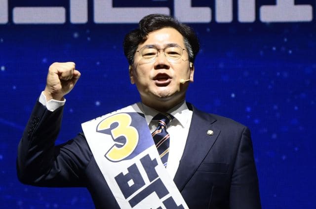 박찬대 더불어민주당 최고위원이 지난달 28일 서울 송파구 올림픽공원 체조경기장에서 열린 제 5차 정기전국대의원대회에서 정견 발표를 하고 있다. 국회사진기자단