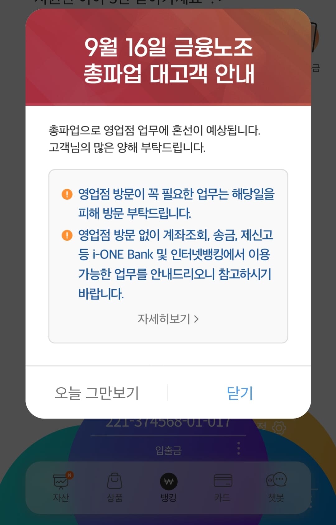 9월 16일 금융노조 총파업 대고객 안내 총파업으로 영업점 업무 혼선 예상 방문이 꼭 필요한 업무는 해당일을 피해 방문 부탁 방문없이 계좌조회, 송금, 제신고 등 앱 인터넷뱅킹 이용