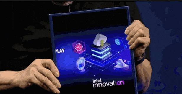 27일(현지시각) 미 캘리포니아 산호세 맥에너리 컨벤션 센터에서 열린 인텔 이노베이션 2022 행사에서 삼성디스플레이의 화면이 늘어나는 디스플레이가 처음으로 공개됐다.