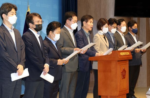 더불어민주당 윤건영(왼쪽부터), 김의겸 의원 등 문재인 정부 청와대 출신 의원들이 3일 국회 소통관에서 기자회견을 열어 감사원의 문재인 전 대통령 서면조사 통보를 비판하고 있다. 이들은 “‘전임 정부 괴롭히기’ 총동원 작전 그 이상도 이하도 아니다”라고 했다./이덕훈 기자