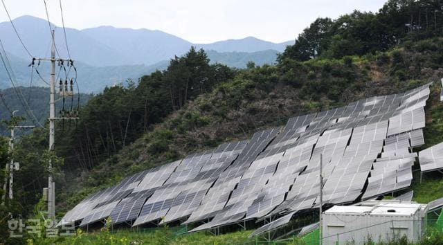 야산 언덕배기에 설치된 태양광 발전소의 모습. 한국일보 자료사진