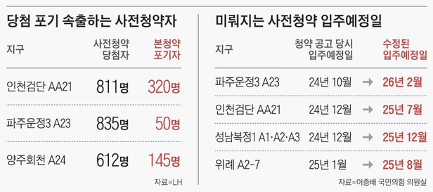입주 때까지 무주택 자격을 유지해야 하는 사전 청약 당첨자들은 입주 예정일이 미뤄지면 자금 조달과 임차 일정에 차질이 생길 수밖에 없다. 박합수 건국대 부동산학과 겸임교수는 “사전 청약 제도를 처음 도입한 이명박 정부 때도 사전 청약에서 본청약까지 최장 8년이 걸려 절반이 넘게 입주를 포기했다”며 “사전 청약과 입주까지 간극을 줄이지 않으면 결국 실패가 되풀이될 것”이라고 말했다.
