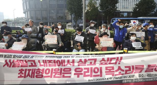 전장연 시위는 최 의원의 5일 국정감사 발언을 규탄하기 위해 이뤄졌다. 최 의원은 김씨같은 중증장애인의 시설 강제 퇴소 사례를 언급하며 “장애인 인권·복지보다 탈시설 그 자체를 우선적으로 추진하는 사고방식 때문이다. 비정상적인 절차로 탈시설 된 장애인에 대한 조사가 필요하다”고 말했다.