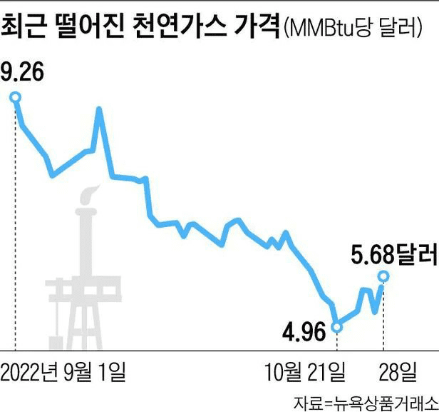 수개월 전만 하더라도 전쟁 여파로 역대 최고 가격을 기록했던 가스 가격이 최근 하락세를 보이는 것은, 각국이 난방용 가스 소비가 늘어나는 겨울을 앞두고 가스 재고량을 최대한 늘리고 있기 있기 때문이다. 재고 확충용 공급이 수요를 초과해 가격이 떨어지는 것이다. 특히 유럽 각국은 최근 러시아의 ‘가스 공급 축소’ 위협 여파로 석탄발전소를 재가동하는 등 에너지원 다변화 정책을 펴고 있기 때문에 가스 의존도가 통상보다 떨어졌다. 여기에 최근 몇 주간 유럽·미국 기온이 예년보다 높아 가스 소비가 줄면서 가스 값 급락을 부채질한 측면도 있다.