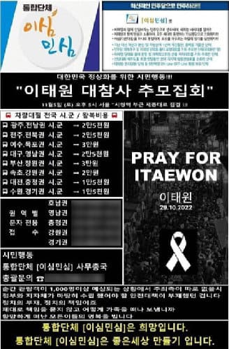 앞서 전날 온라인커뮤니티와 소셜미이어에는 ‘이태원 대참사 추모 집회’, ‘PRAY FOR 이태원’이라는 슬로건을 내건 집회 예고 게시물이 공유됐다.