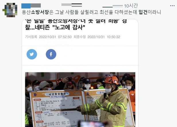앞서 이태원 참사가 발생한 지난달 29일 밤 최 서장은 현장에서 구조활동을 펼치며 피해 상황에 대한 언론 브리핑을 네 차례 진행했다. 당시 최 서장의 목소리는 침착했지만, 마이크를 쥔 왼손을 덜덜 떨고 있었다. 이 모습은 짧은 클립영상으로 제작됐고 ‘손 떠시는 용산소방서장님’이라는 제목으로 여러 온라인 커뮤니티와 소셜미디어에 퍼졌다.
