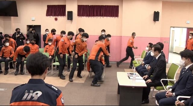 이 대표 우측 편에 배석하고 있던 용산소방서 관계자 18명 가운데 11명은 이 소리에 곧장 자리를 박차고 일어나 강당 밖으로 뛰쳐나갔다. 사회자인 행정팀장은 이런 상황에 대해 “일선 소방서는 항상 출동에 대비하고 있기 때문에, 출동 대원들이 출동(지령)이 나면 이렇게 신속하게 나가고 있다. 이 점 양해 부탁드린다”라고 말했다. 그러고선 이 대표를 참석자 대표로 소개하고, 업무 보고를 이어갔다.