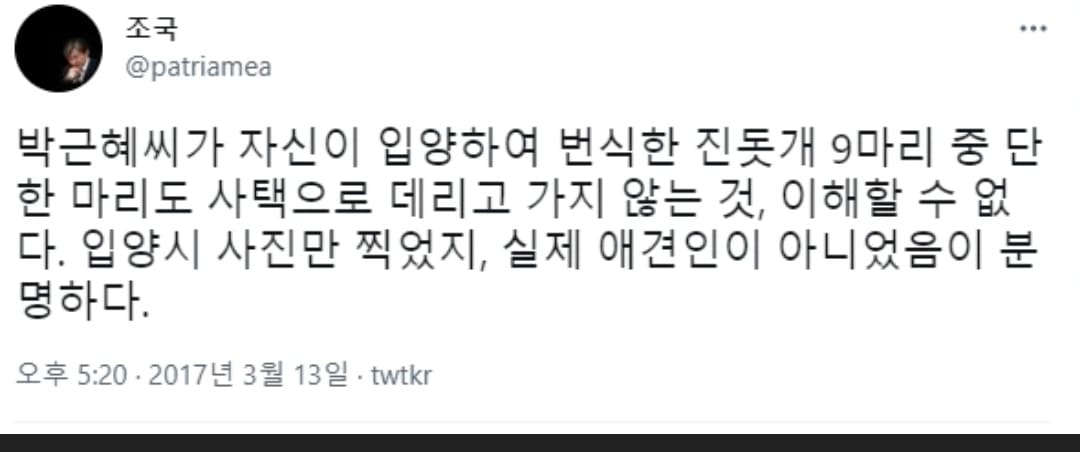 조 전 장관은 2017년 3월 트위터에 “박근혜 씨가 자신이 입양하여 번식한 진돗개 9마리 중 단 한 마리도 사택으로 데리고 가지 않은 것 이해할 수 없다”며 “입양시 사진만 찍었지, 실제 애견인이 아니었음이 분명하다”는 글을 올렸다.