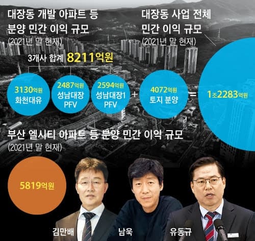 아파트 분양에서도 김만배씨가 소유한 화천대유의 이익이 가장 컸다. 토지 분양에서 얻은 화천대유 배당금(577억원), 화천대유 소유의 천화동인 1호 배당금(1208억원)에 아파트 분양 이익까지, 김씨에게만 대장동 개발 이익 4915억원이 돌아간 것이다.