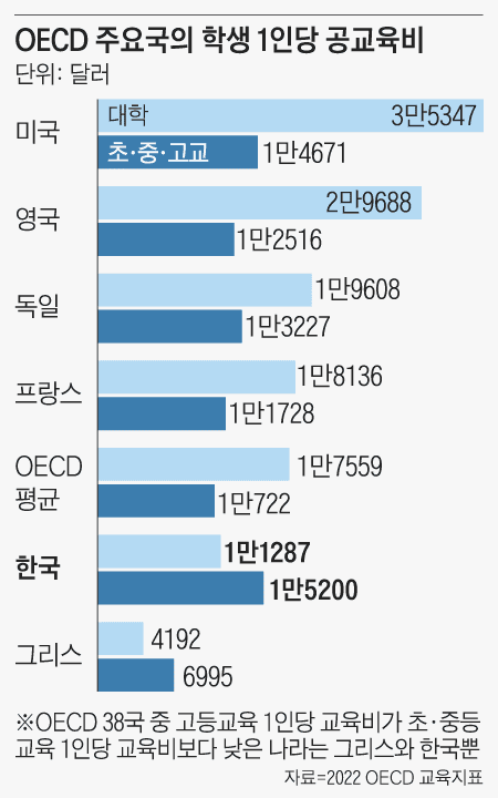 이 같은 ‘교육 재정 불균형’은 갈수록 심각해지고 있다. 한국대학교육협의회에 따르면 초·중·고 1인당 공교육비는 2014년 OECD 평균을 앞지른 뒤로 계속 격차를 벌려 2019년 기준 초등학생은 OECD 평균의 134%, 중·고교생은 150%에 달했다. 반면, 대학생은 평균의 64%에 그쳤다. OECD 회원 38국 중 대학생 1인당 공교육비가 초·중·고보다 낮은 나라는 한국과 그리스뿐이다.