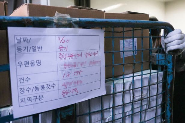 국세청이 종합부동산세 고지서 발송을 시작한 21일 오후 서울 성북구 국세청 우편물자동화센터에서 관계자가 종부세 고지서가 담긴 운반 수레를 옮기고 있다./연합뉴스