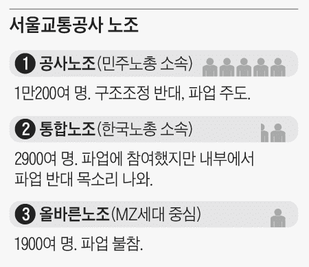 서울교통공사 노조가 총파업 돌입 하루 만인 1일 새벽 임금·단체협약에 합의하고 파업을 철회한 것을 두고 공사의 MZ세대(1980년대 초~2000년대 초 출생한 세대) 젊은 직원들 역할이 컸다는 평가가 나온다. 공사의 3개 노조 중 제2노조인 서울교통공사통합노조(한국노총 산하)와 제3노조인 서울교통공사올바른노조 소속 젊은 직원들이 파업 반대 목소리를 강하게 내면서 파업 동력이 약화했다는 것이다. 노동계 관계자는 “공사의 젊은 직원들이 파업 정당성에 문제를 제기한 게 파업을 하루 만에 끝내도록 만든 중요한 계기”라고 했다.