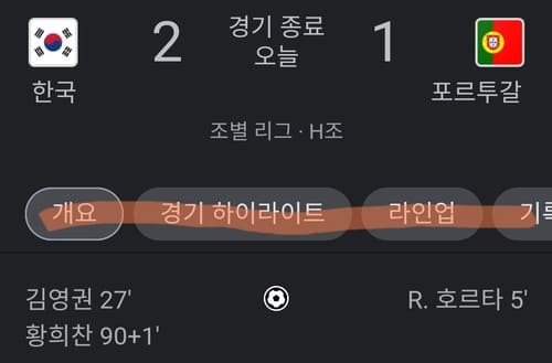 2022 월드컵 16강 진출 확정 한국 2점 vs 포르투갈 1점 김영권 27' 황희찬 90+1' [경기속보] 대한민국 김영권 동점골 황희찬 후반 45분 역전골 손흥민 도움