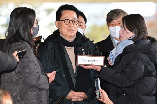 박지원 전 국가정보원장이 14일 서울 서초구 서울중앙지검에 출석하며 취재진 질문에 답하고 있다. 문호남 기자
