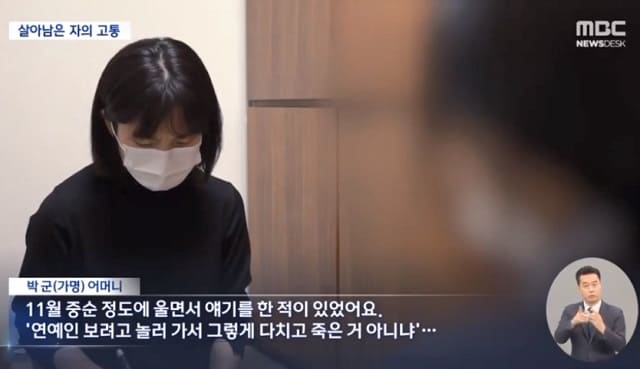 숨진 10대 A군의 어머니는 “꼭 전할 말이 있다”며 14일 MBC뉴스 인터뷰에 응했다. 그는 “(아이가) 11월 중순 정도에 울면서 얘기를 한 적이 있었다. ‘연예인 보려고 놀러 가서 그렇게 다치고 죽은 거 아니냐’는 등 자기 죽은 친구들을 모욕하는 듯한 댓글들을 보면서 굉장히 화를 많이 냈다”고 털어놨다.