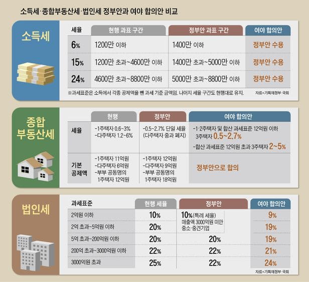 소득세·종합부동산세·법인세 정부안과 여야 합의안 비교